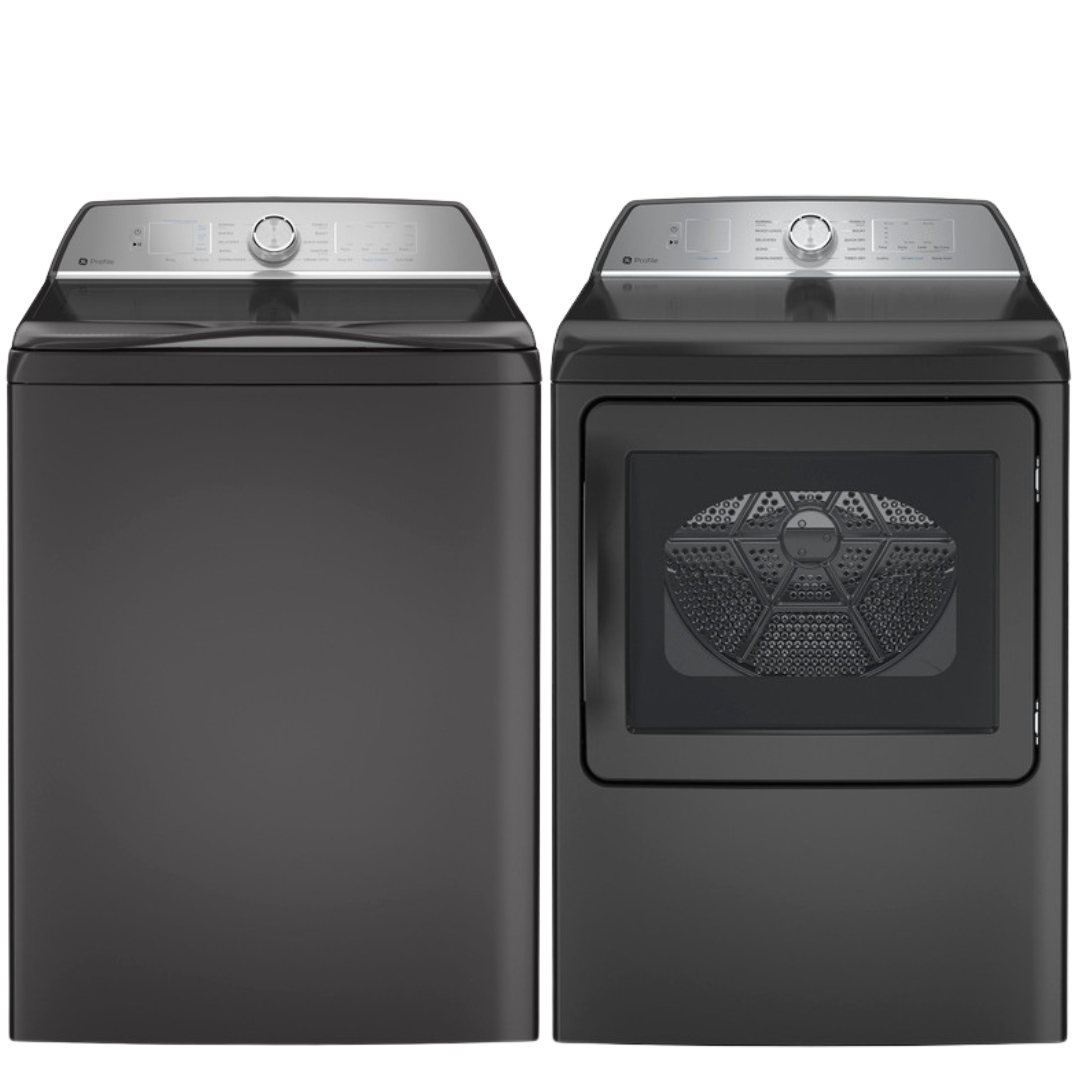 GE Profile 5.0Cu FlexDispense Washer & 7.4Cu Electric Dryer, Sanitize Sensor Dry